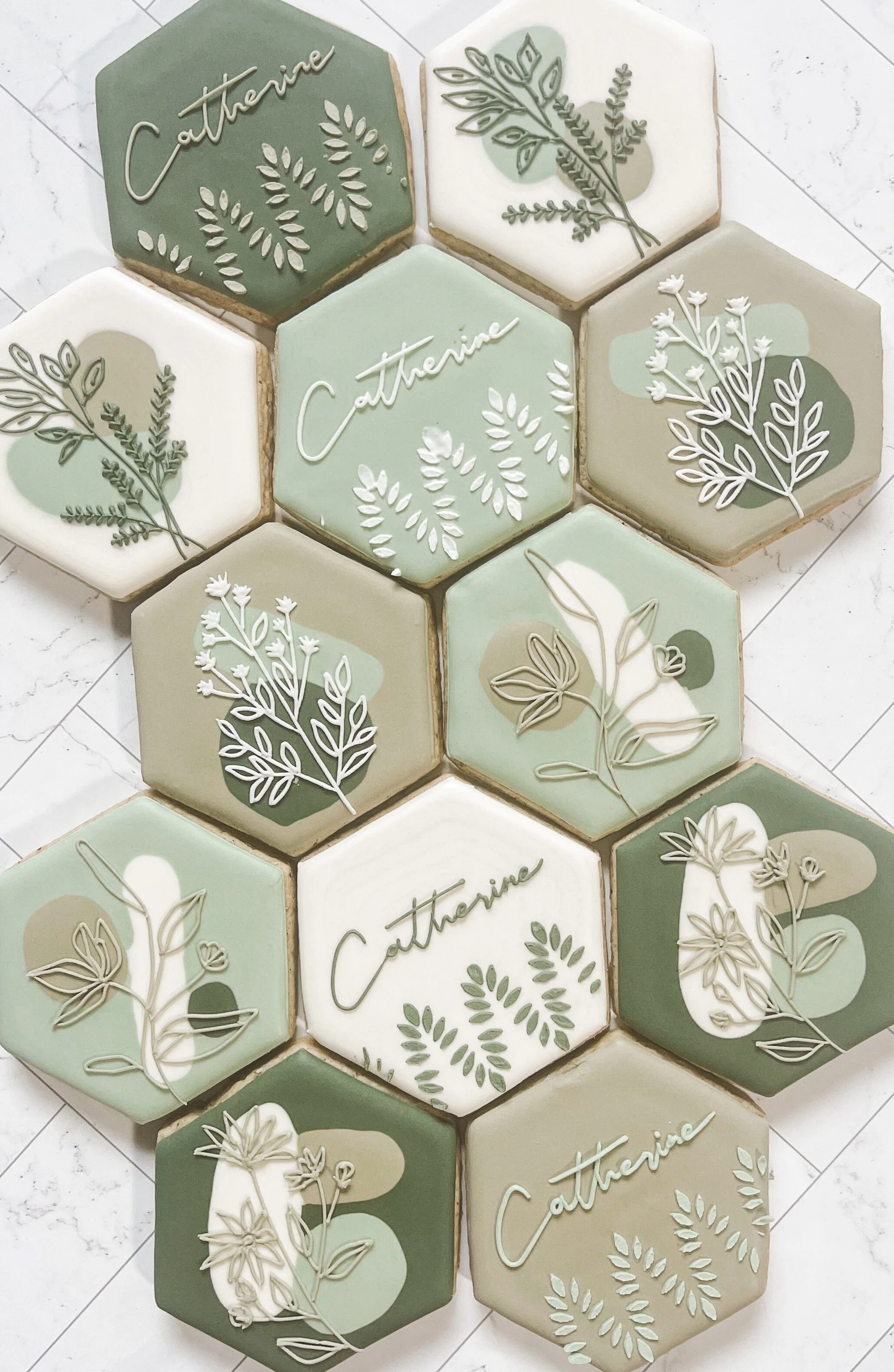 Four or six designs in our signature vanilla bean sugar cookies with vanilla royal icing . Maximum of 8 colors. May include elaborate hand designs, intricate letter piping, airbrushing, simplistic florals, and 2 sprinkles.